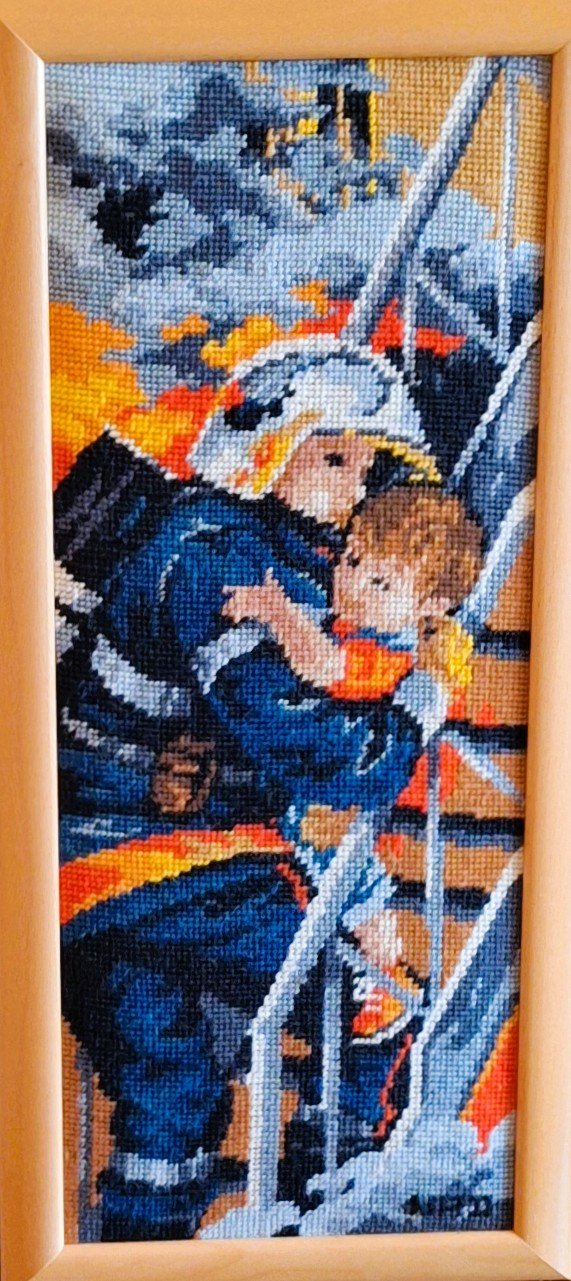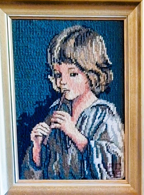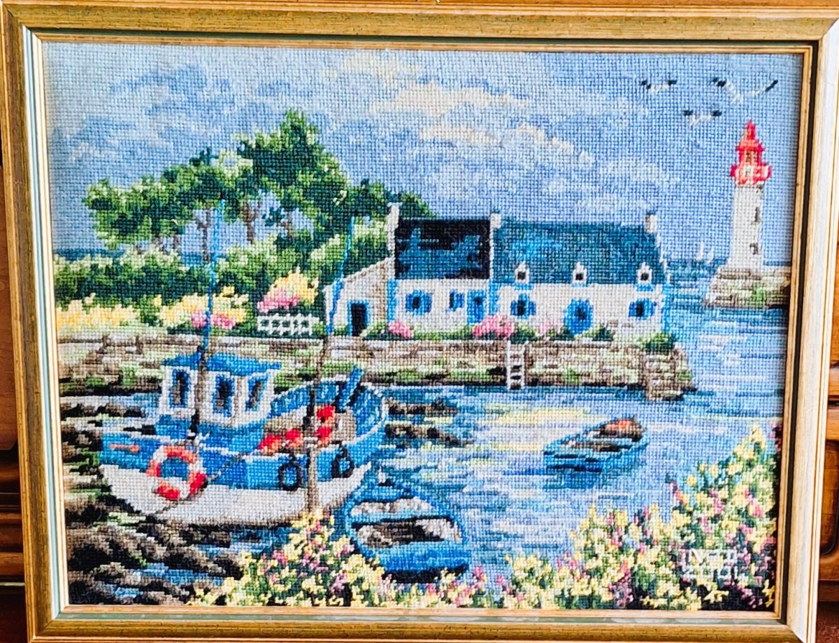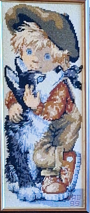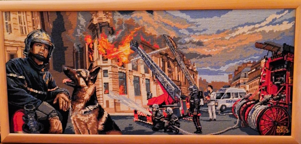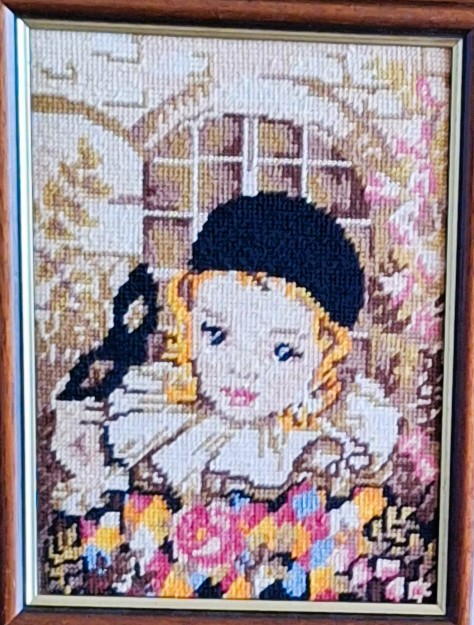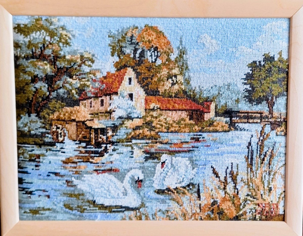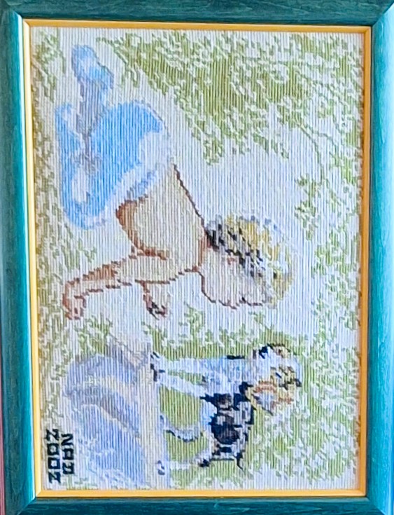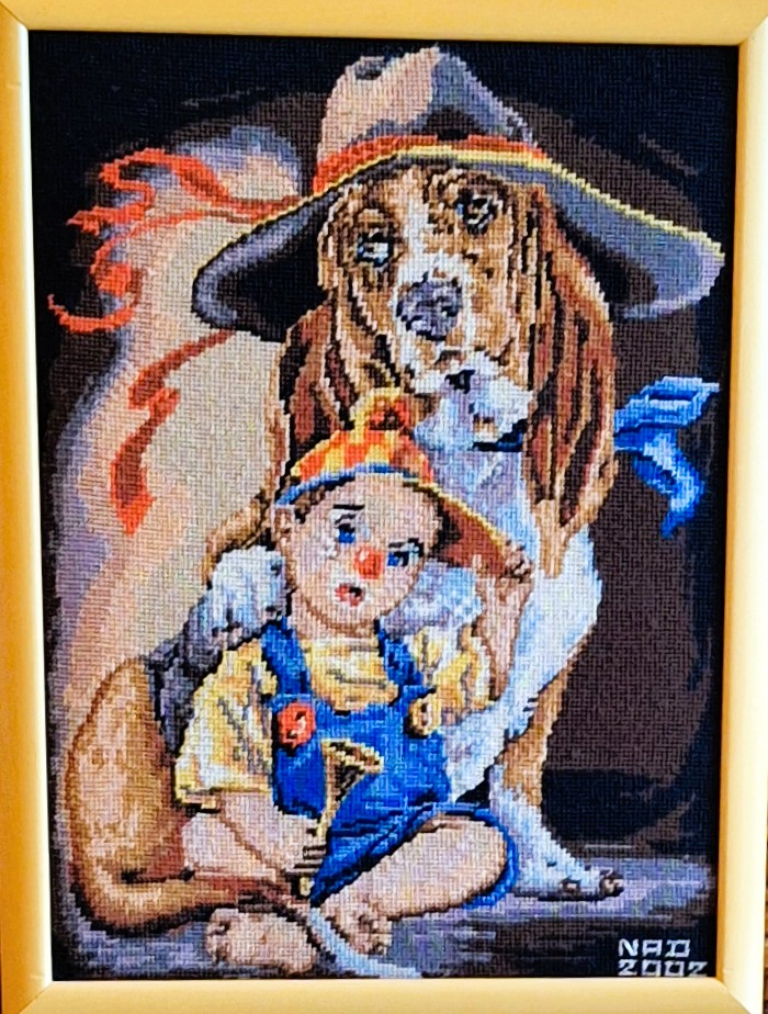 Mike à été fait avec ca peinture pour le fond et moi pour la broderie dessus. il n'était pas simplement un ami Gilbert était un grand peintre, tous ces encadrements ont été fait par lui, merci à toi qui es partit trop vite 1944-2020