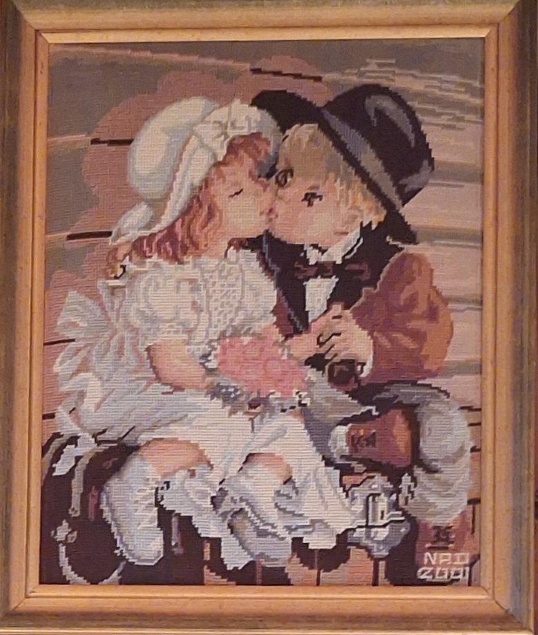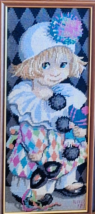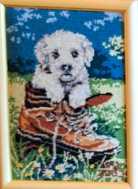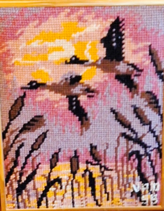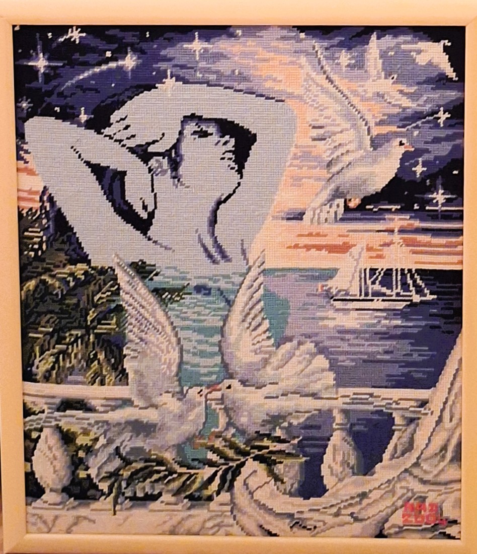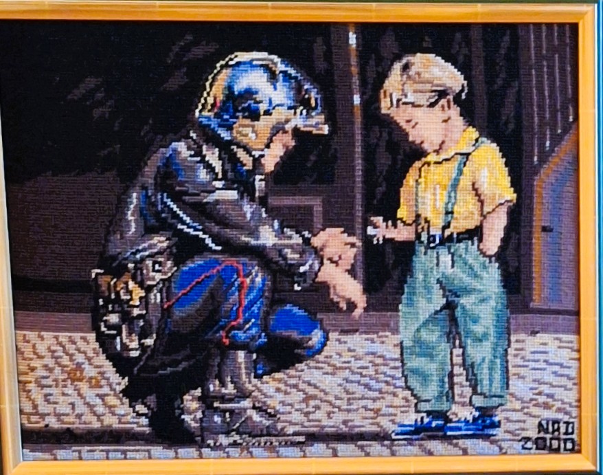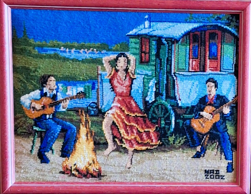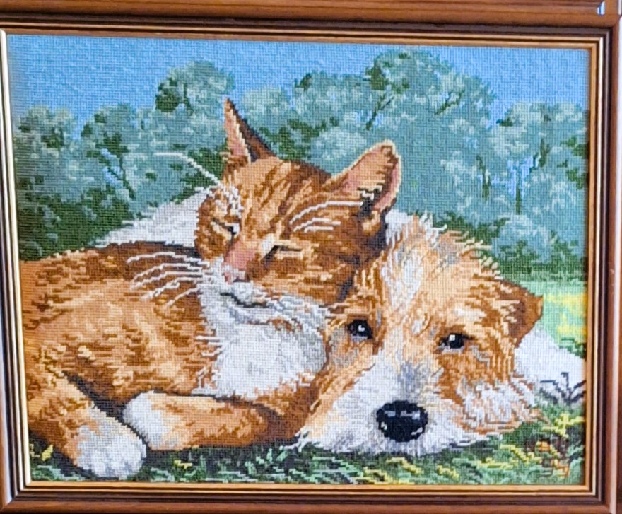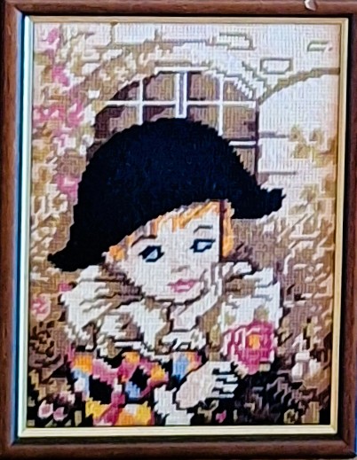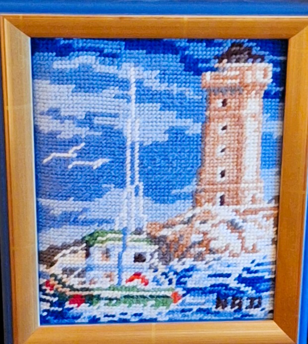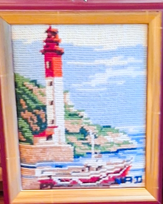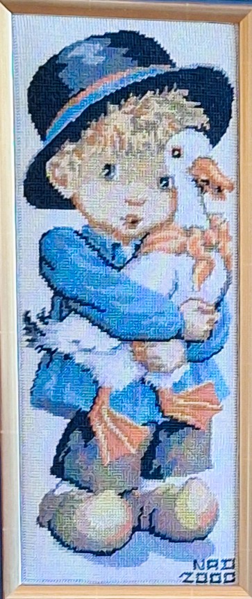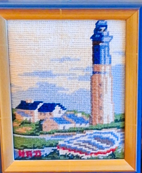 Mike à été fait avec ca peinture pour le fond et moi pour la broderie dessus. il n'était pas simplement un ami Gilbert était un grand peintre, tous ces encadrements ont été fait par lui, merci à toi qui es partit trop vite 1944-2020