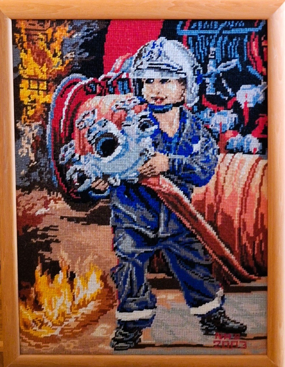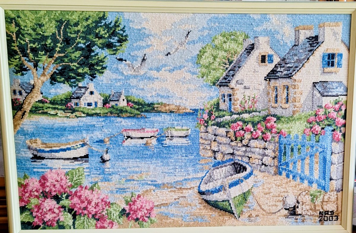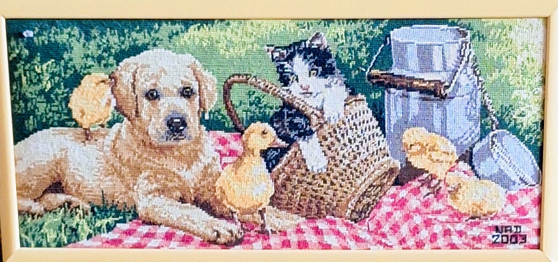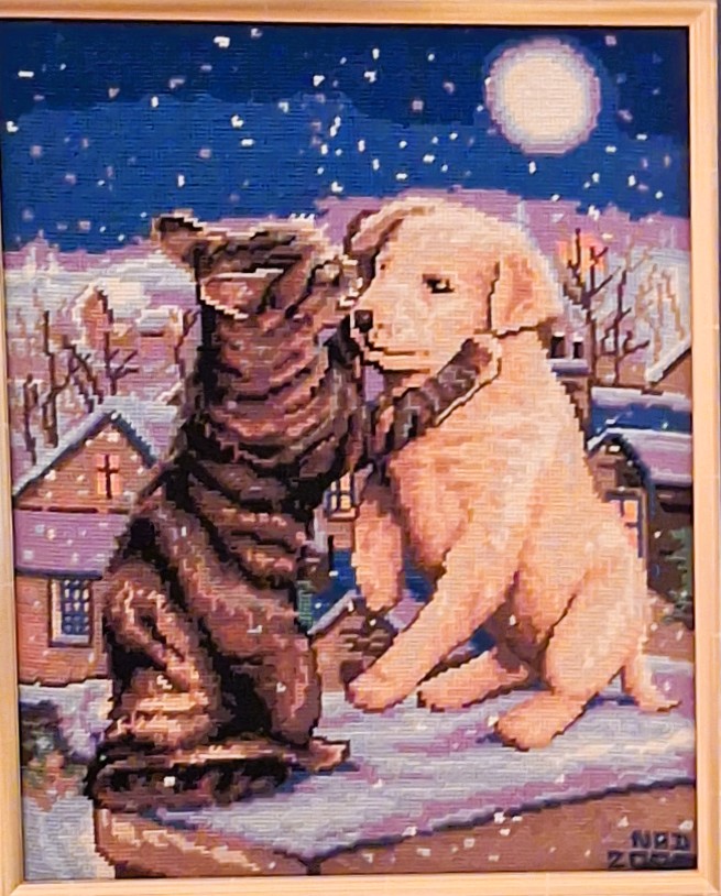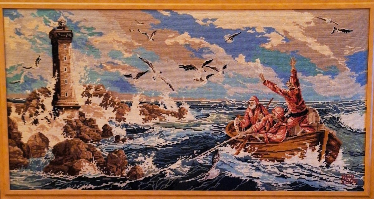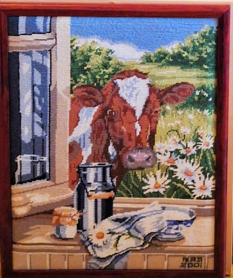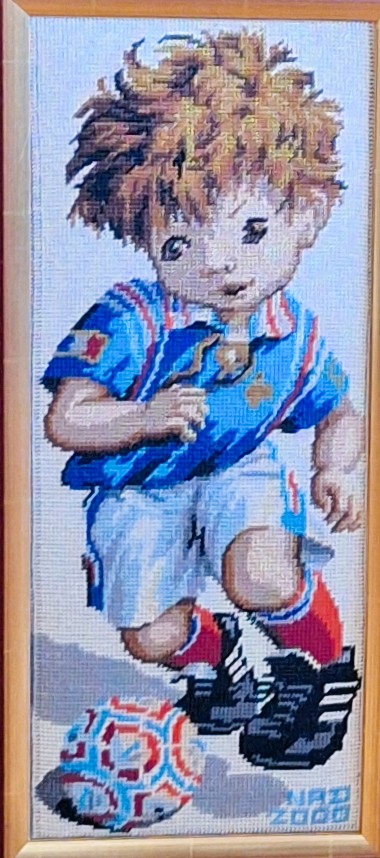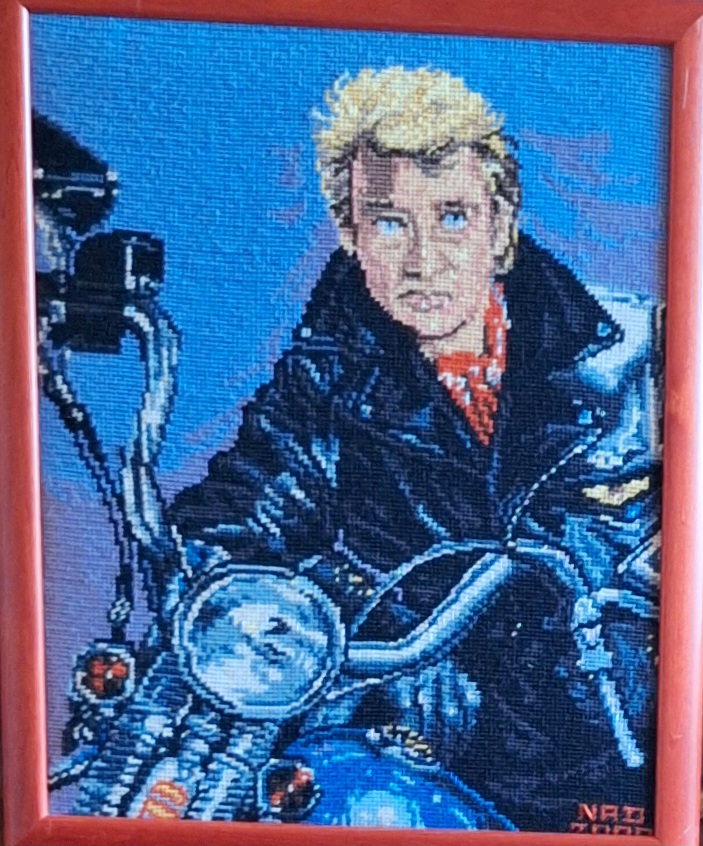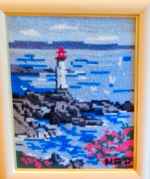 Mike à été fait avec ca peinture pour le fond et moi pour la broderie dessus. il n'était pas simplement un ami Gilbert était un grand peintre, tous ces encadrements ont été fait par lui, merci à toi qui es partit trop vite 1944-2020