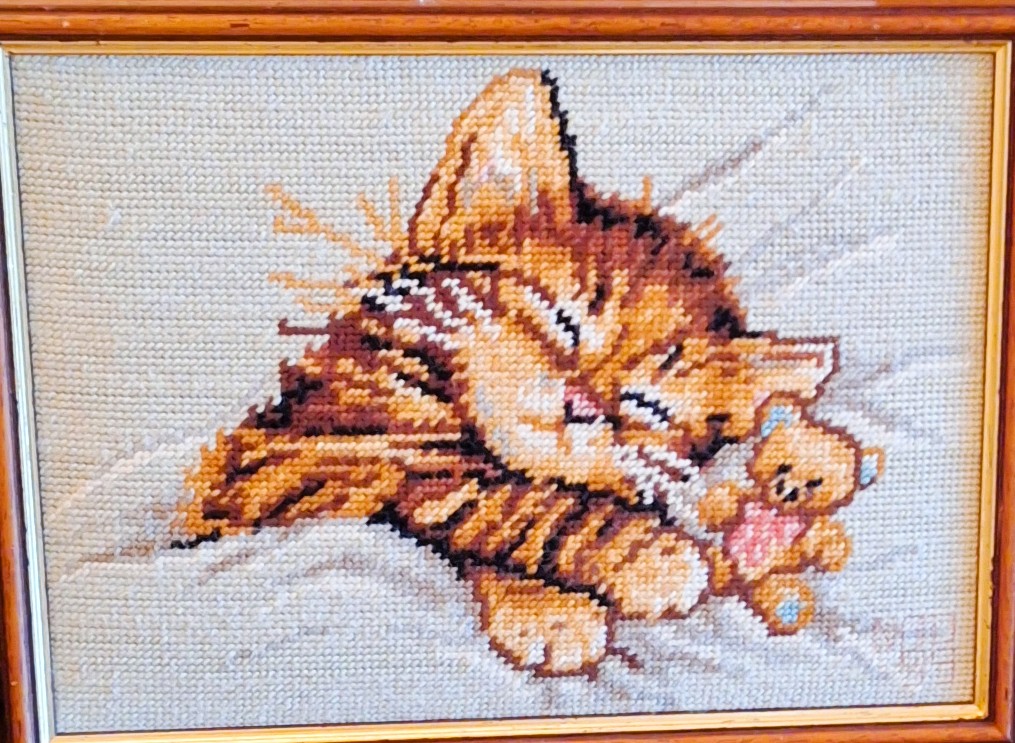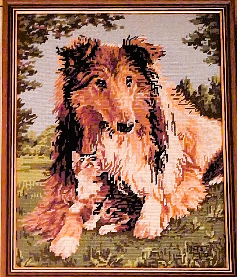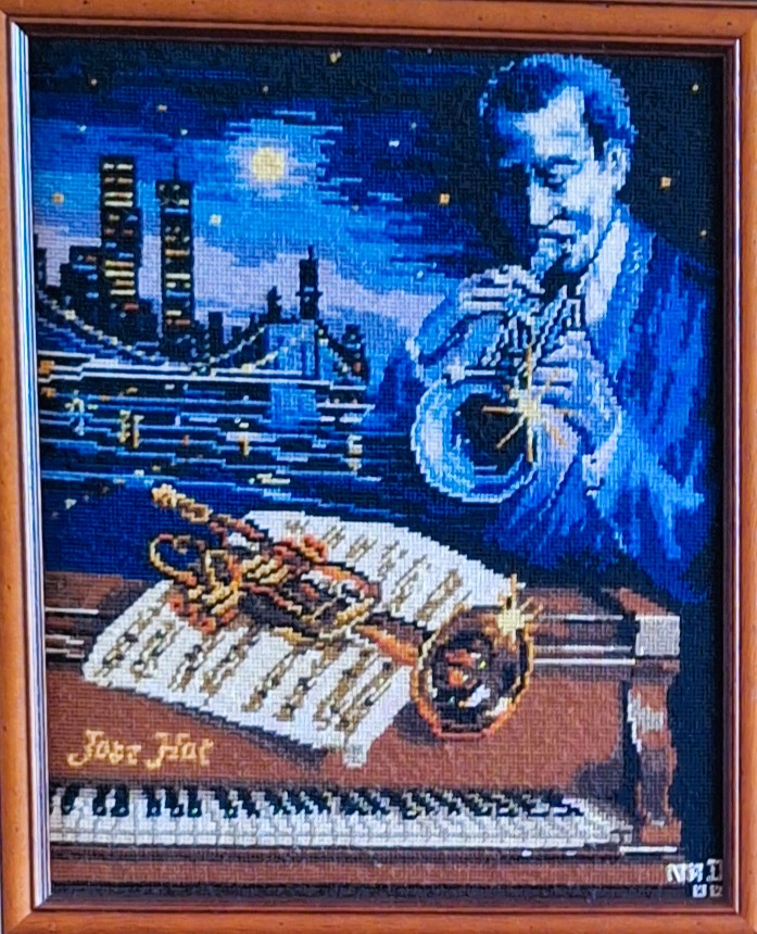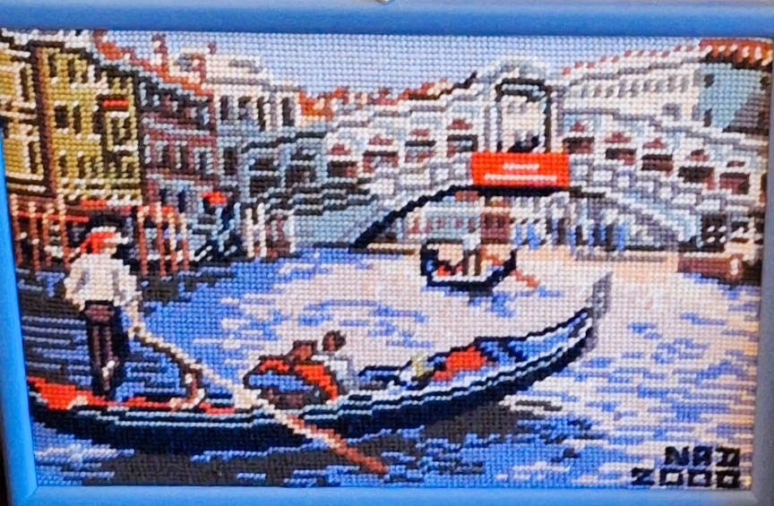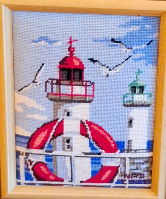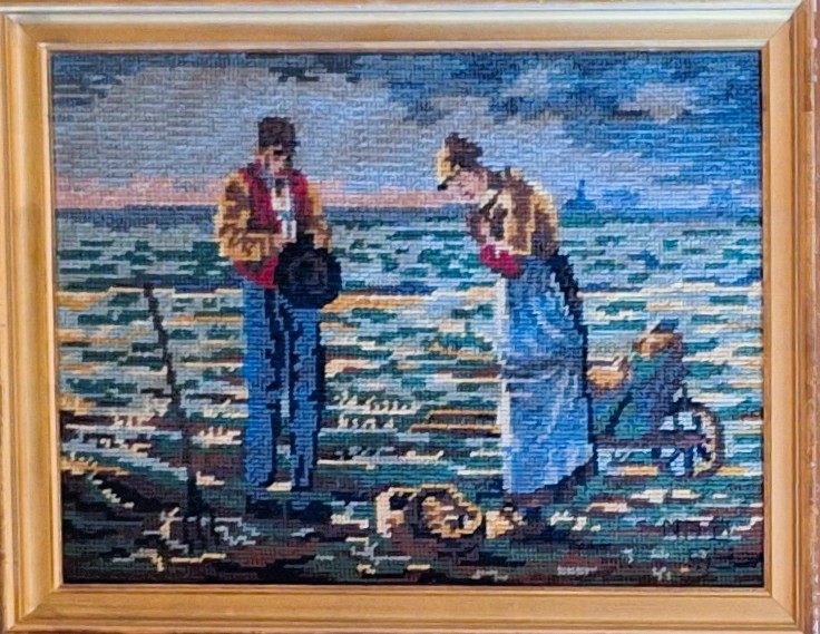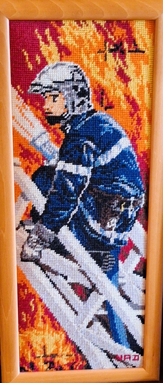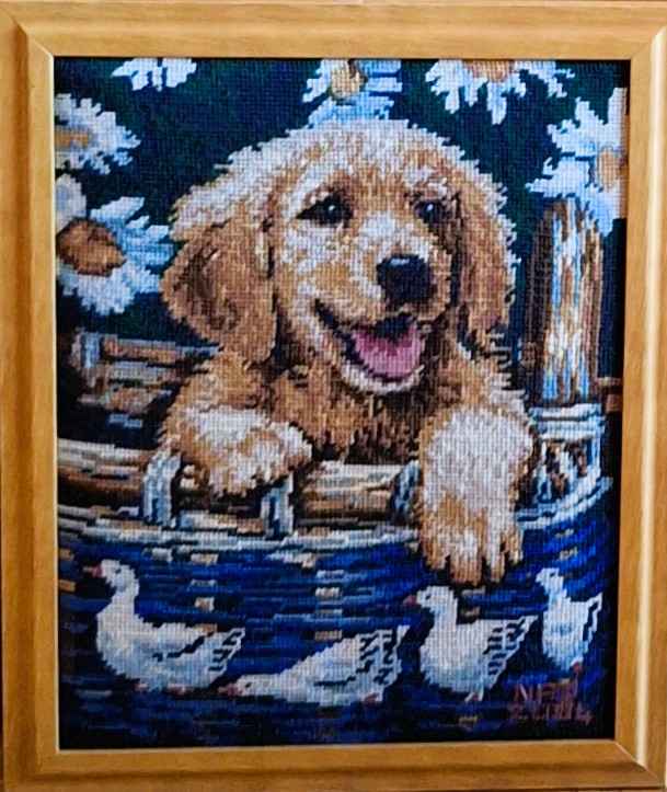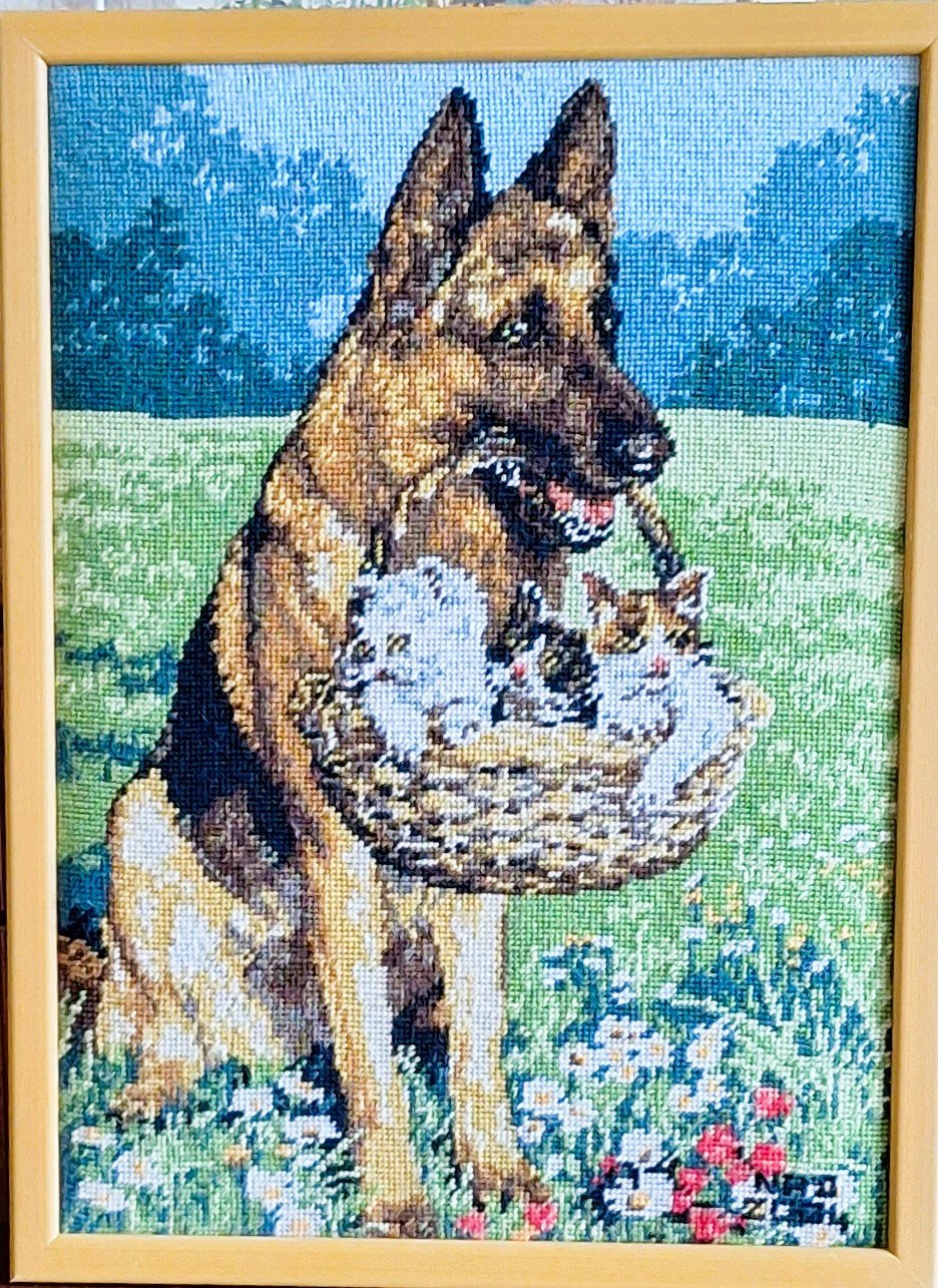 Mike à été fait avec ca peinture pour le fond et moi pour la broderie dessus. il n'était pas simplement un ami Gilbert était un grand peintre, tous ces encadrements ont été fait par lui, merci à toi qui es partit trop vite 1944-2020
