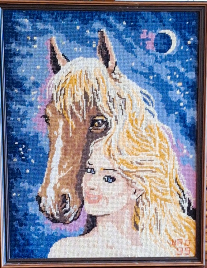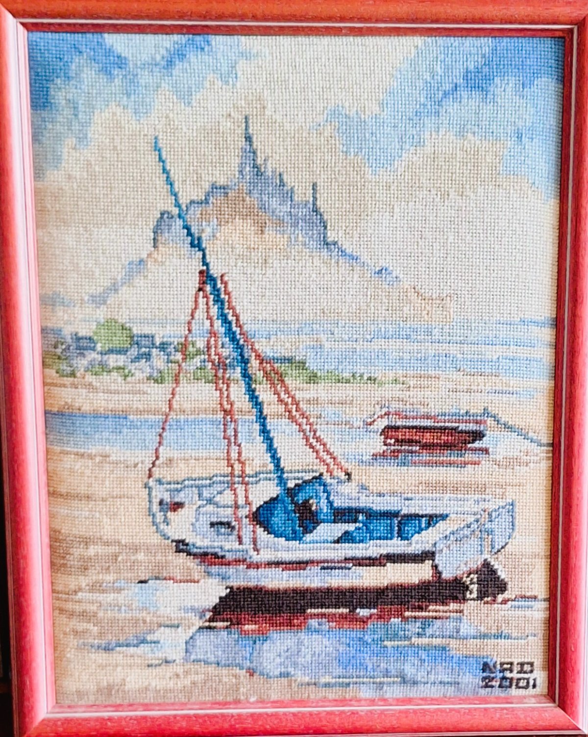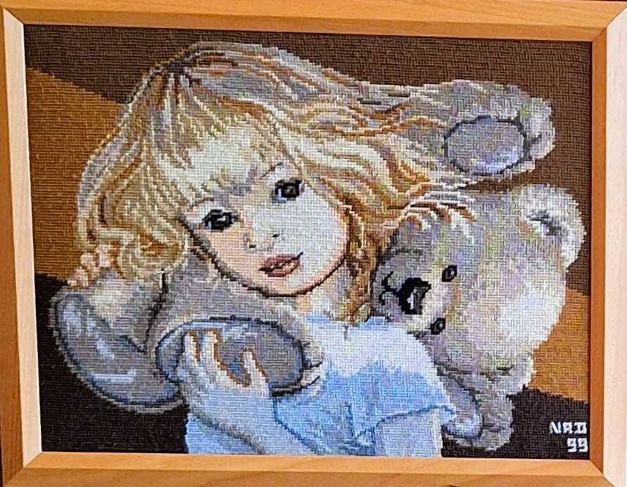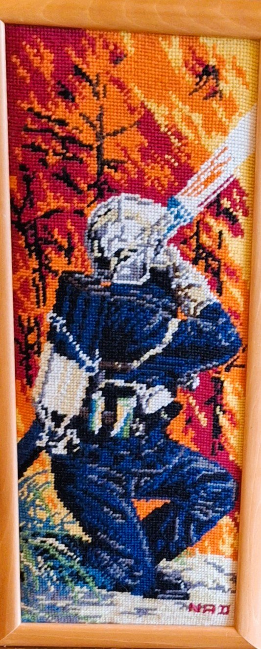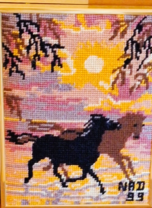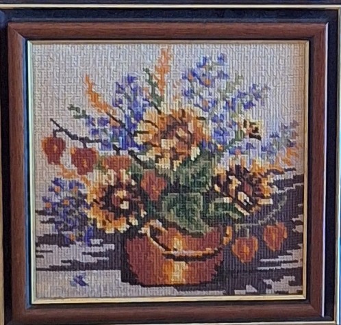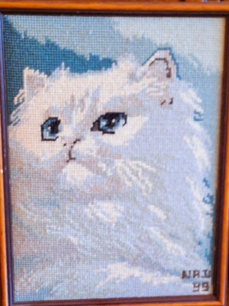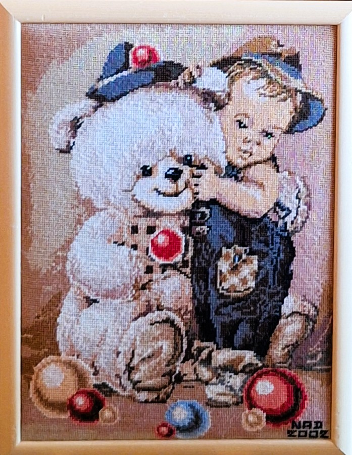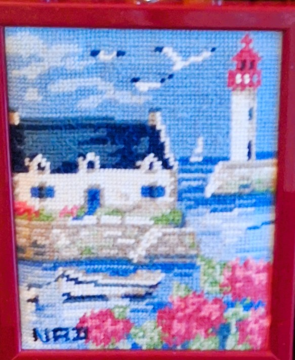 Mike à été fait avec ca peinture pour le fond et moi pour la broderie dessus. il n'était pas simplement un ami Gilbert était un grand peintre, tous ces encadrements ont été fait par lui, merci à toi qui es partit trop vite 1944-2020