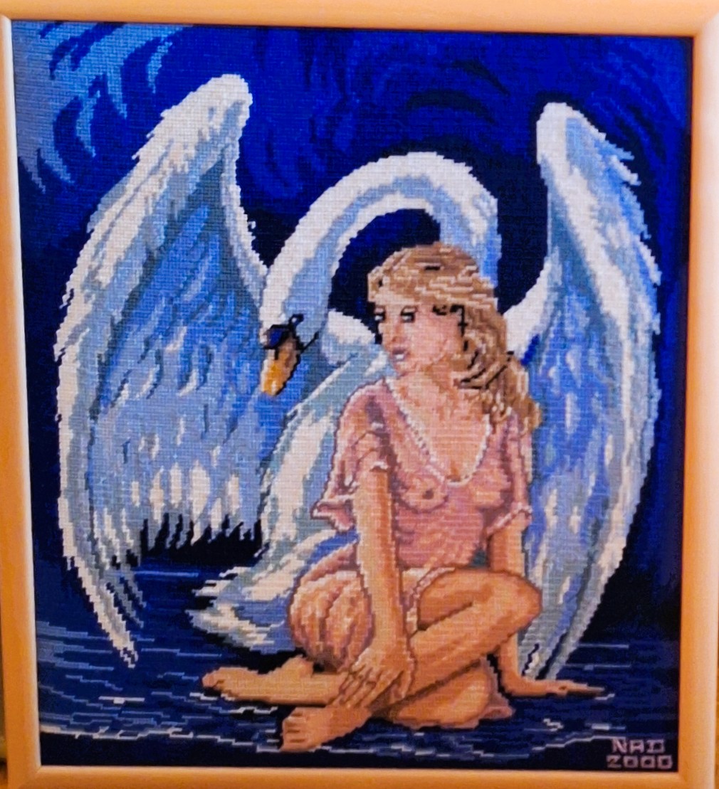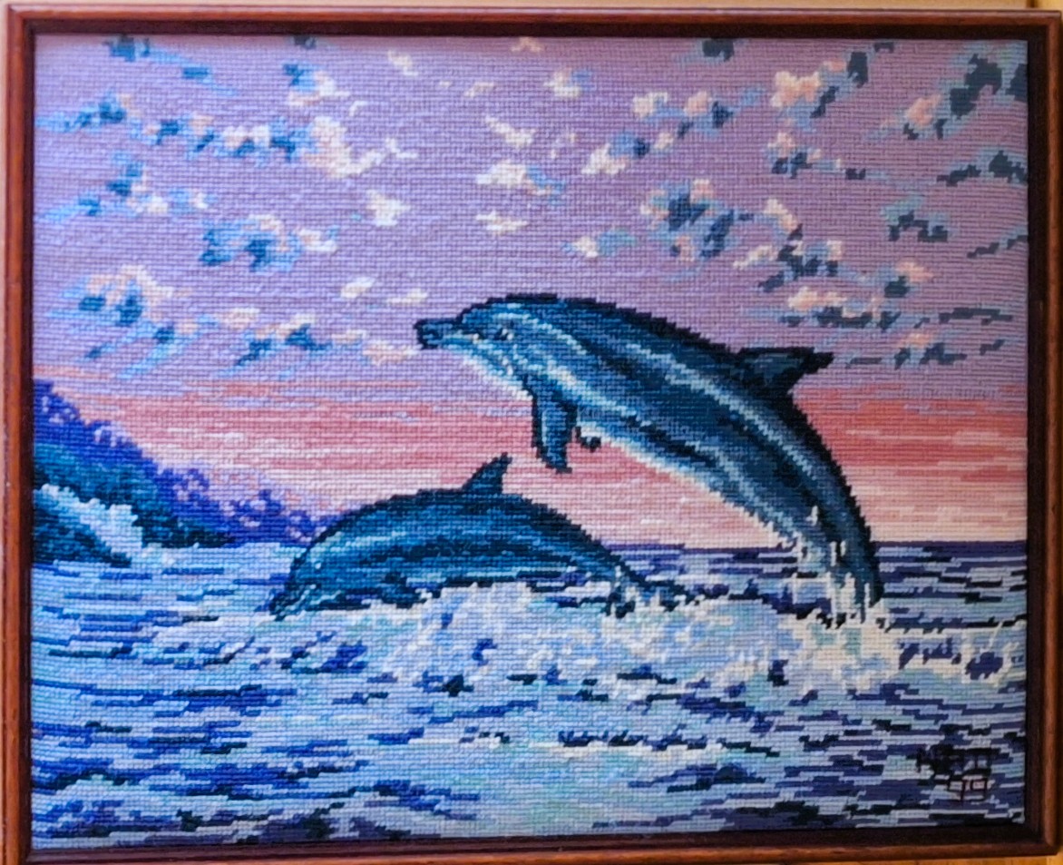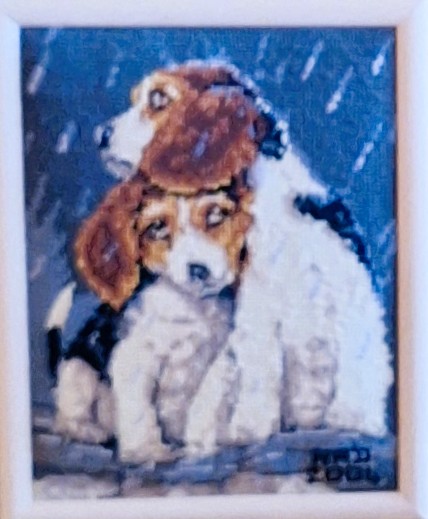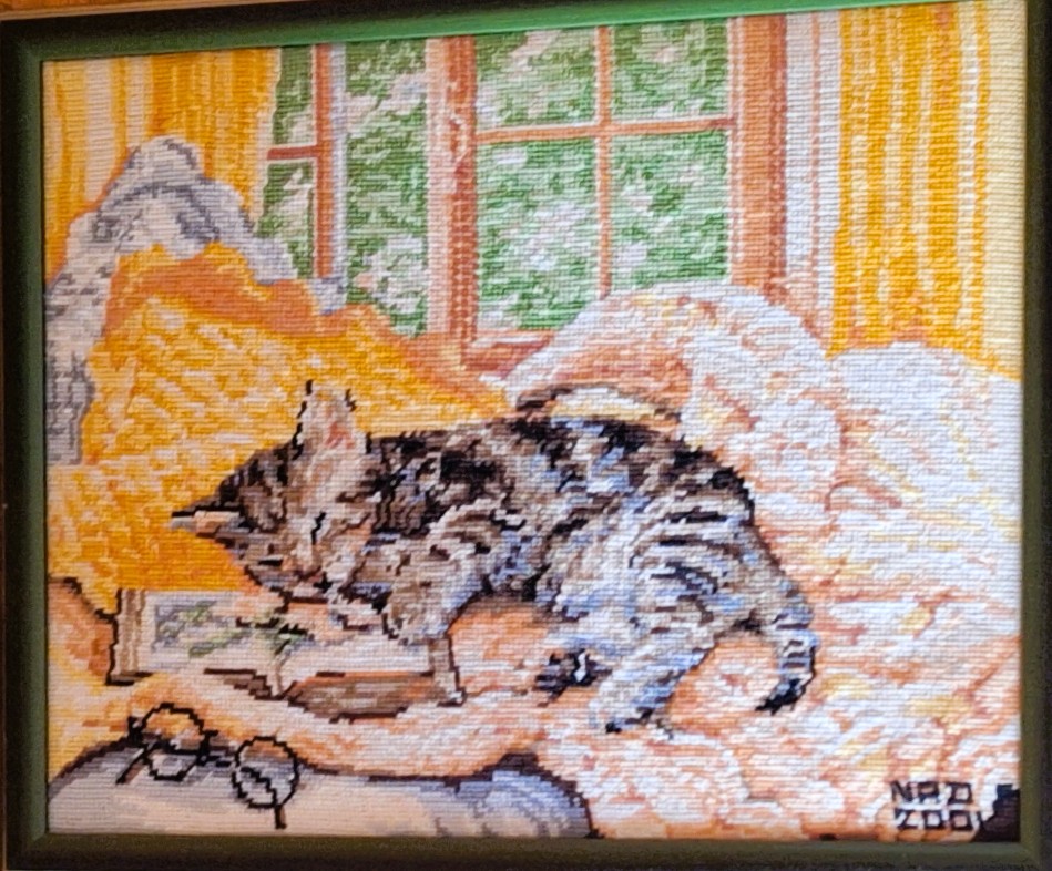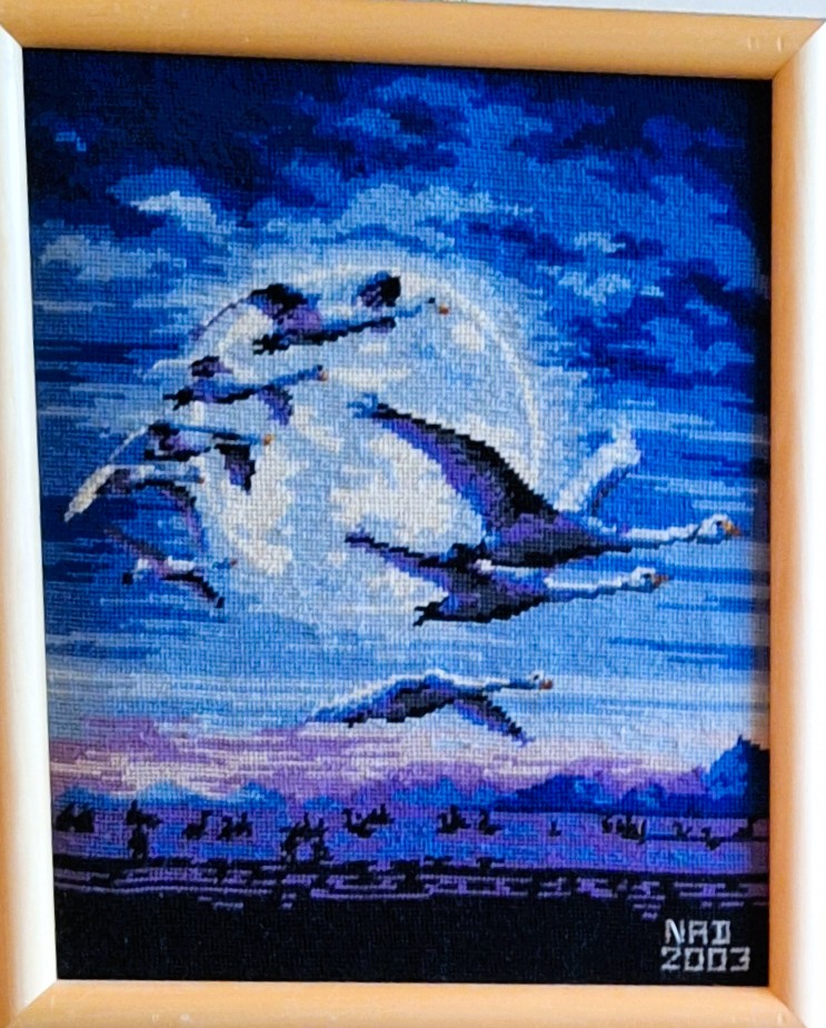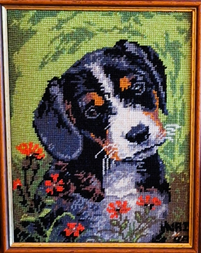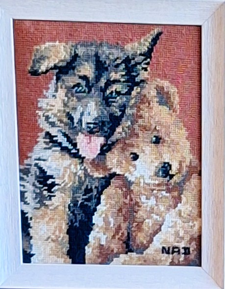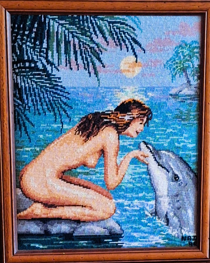 Mike à été fait avec ca peinture pour le fond et moi pour la broderie dessus. il n'était pas simplement un ami Gilbert était un grand peintre, tous ces encadrements ont été fait par lui, merci à toi qui es partit trop vite 1944-2020